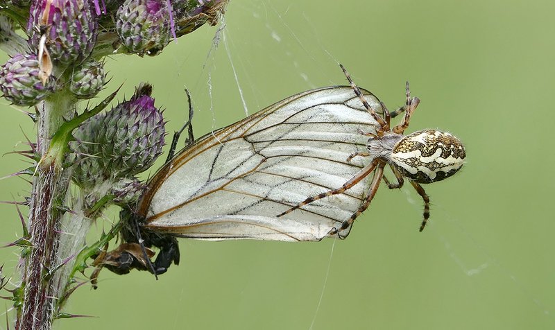 Questo ragno (Aculepeira ceropegia) ha catturato una pieride del biancospino (Aporia crataegi). Le cartine di distribuzione da info fauna mostrano la distribuzione delle due specie. Foto: Thomas Reich (WSL)