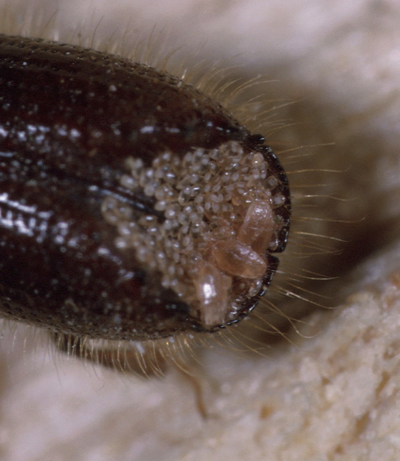 - Anche la rosura prodotta con la perforazione e le feci espulse dagli scolitidi adulti e delle larve possono essere rapidamente colonizzate e decomposte da microrganismi e funghi.