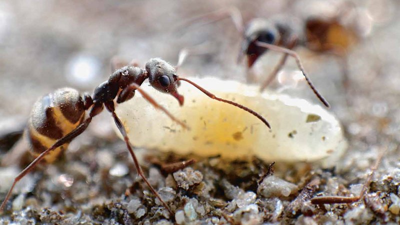 Fig. 3. Due operaie appartenenti alla specie Formica selysi mentre si prendono cura di una larva. Foto: Timothée Brütsch