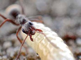 Fig. 1. Formica operaia della specie Formica selysi alle prese con una larva. Foto: Timothée Brütsch