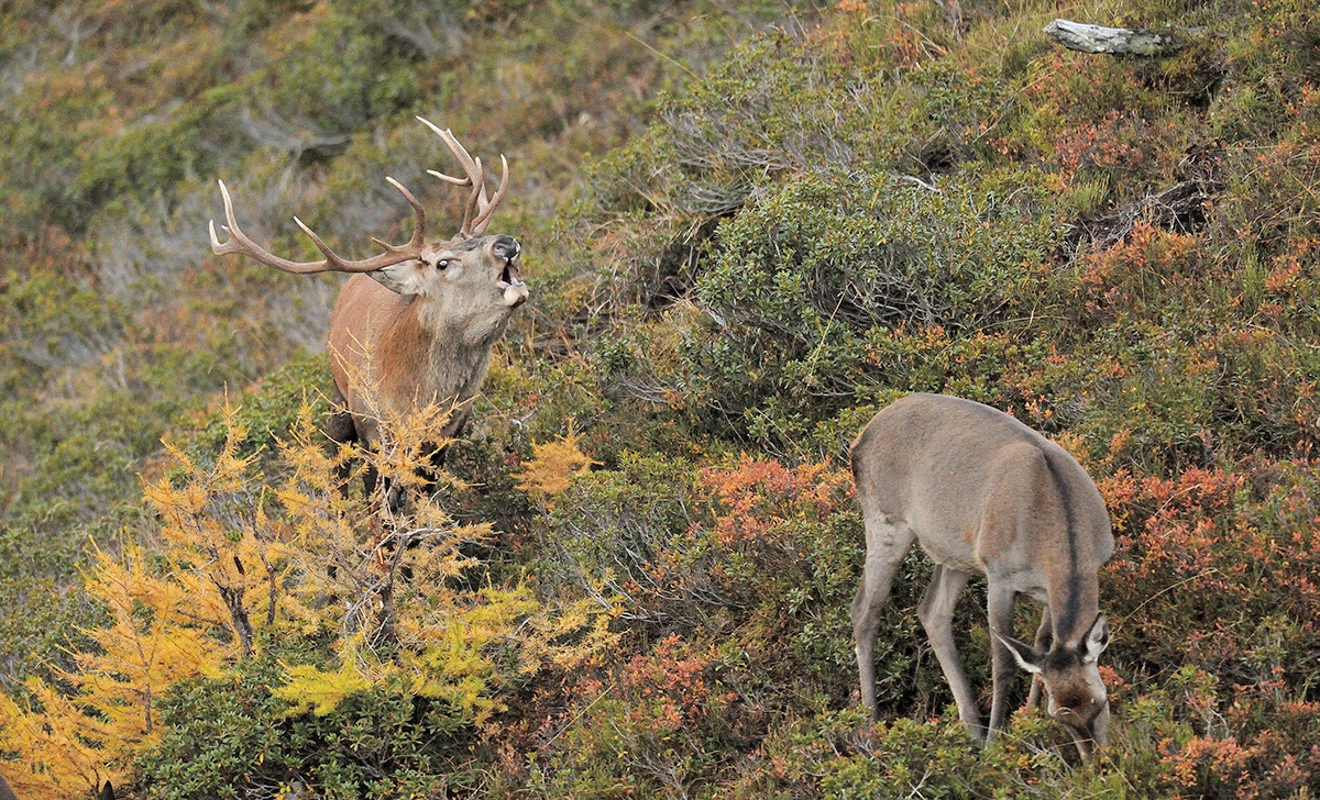 La stagione degli amori è particolarmente interessante. Essa si realizza tra la metà di settembre e la metà di ottobre offrendo uno spettacolo certamente scenografico. L’accoppiamento principale ha luogo di solito nella prima settimana di ottobre, ma nelle zone densamente popolate da cervi può iniziare anche prima. I maschi sono attivi principalmente al crepuscolo e di notte, ma nelle aree nelle quali sono poco disturbati, l'accoppiamento può essere osservato anche in pieno giorno. Verso la fine di agosto, la criniera del maschio in calore si sviluppa e si espande.