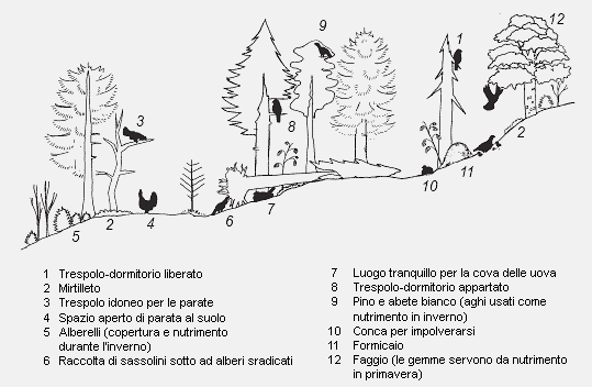 Figura 4 - Come si vede dallo schema, l'habitat ideale per il gallo cedrone è fortemente strutturato. Fonte: UFAM (2001): Gallo cedrone e gestione delle foreste (in tedesco e francese)