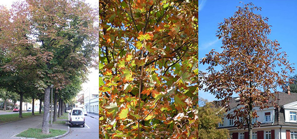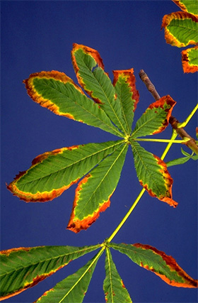 Fig. 5. Foglie di un Castagno d’India con necrosi provocate dall’impiego di sale anti-ghiaccio. Foto: Servizio fitosanitario per il bosco svizzero
