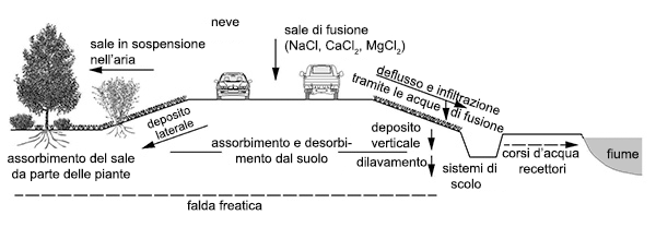 - nuovi apporti diretti nel terreno in seguito alla aspersione di sale anti-ghiaccio (sale in polvere soffiato dal vento, spruzzi provocati dal transito di veicoli, azione dispersiva degli spazzaneve, acque di disgelo)