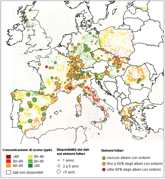 Le concentrazioni medie di ozono a lungo termine durante la fase vegetativa (da aprile a settembre) mostrano che i livelli di ozono nelle foreste europee aumentano da nord a sud tra il 2000 e il 2014. In media, i valori erano 36,2 ppb, variando da14,5 a 70,1 ppb (Fig. 3). Le più alte concentrazioni di ozono nell'aria sono state misurate in Italia, Ticino, Repubblica Ceca, Slovacchia, Romania e Grecia.