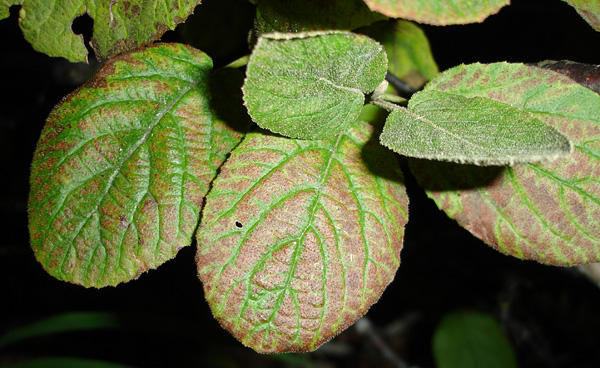 Fig. 2 - Foglie della palla di neve lanosa (Viburnum lantana) con sintomi di ozono.