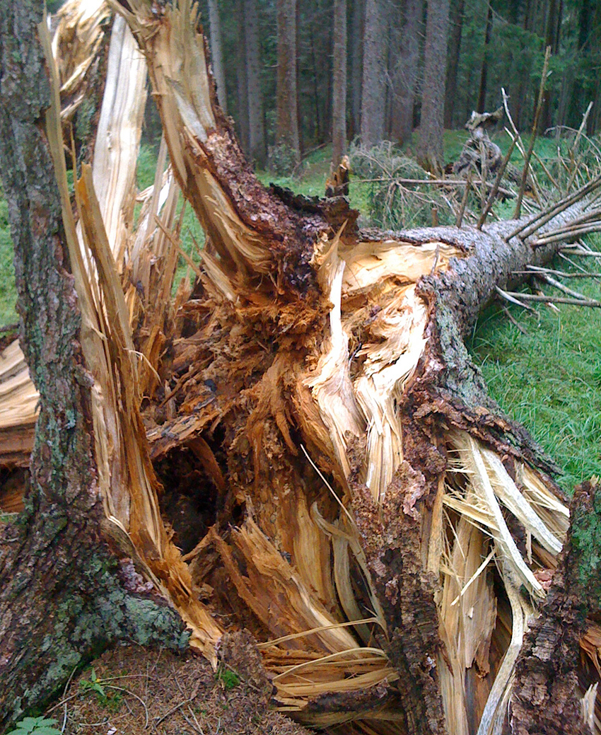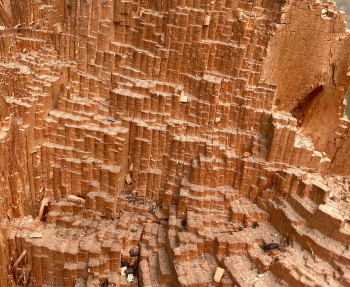 Il marciume del durame può accompagnare lo sviluppo degli alberi per anni, limitandosi a "mangiarli" dall'interno. In casi estremi il durame può essere completamente decomposto, spesso con la complicità di colonie di formiche che si annidano nel legno marcescente. Ciò che rimane è un albero cavo che può vivere tranquillamente per decenni, grazie a un alburno ancora vitale e intatto. Spesso, tuttavia, la stabilità degli alberi può venire compromessa dal marciume dei tronchi. In caso di forti venti gli alberi possono subire delle rotture, sia a livello del tronco, che della ceppaia (Fig. 3).
