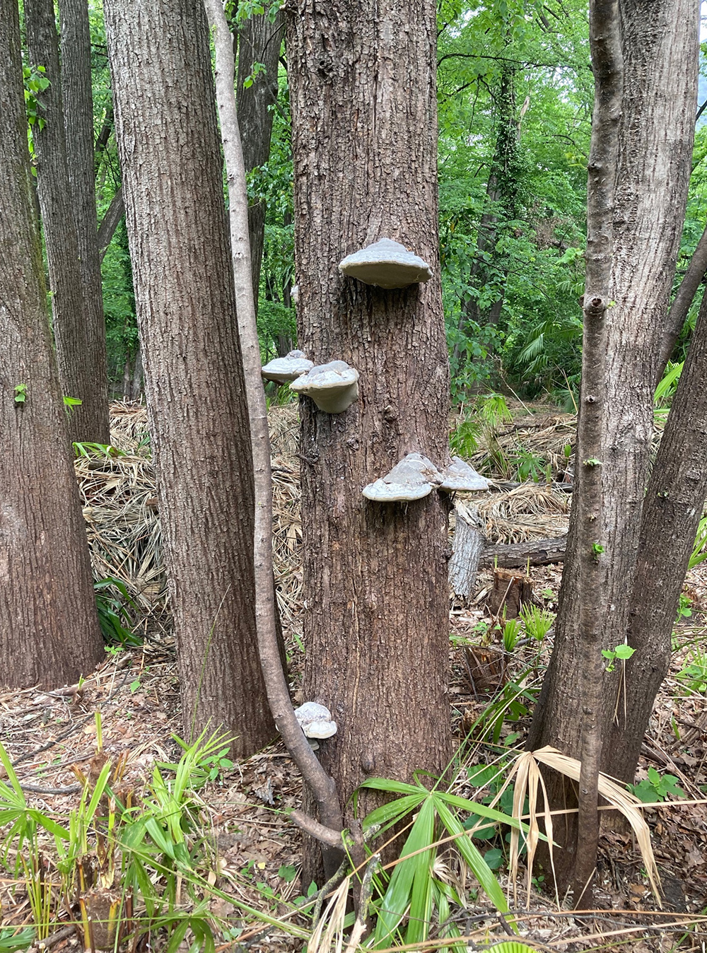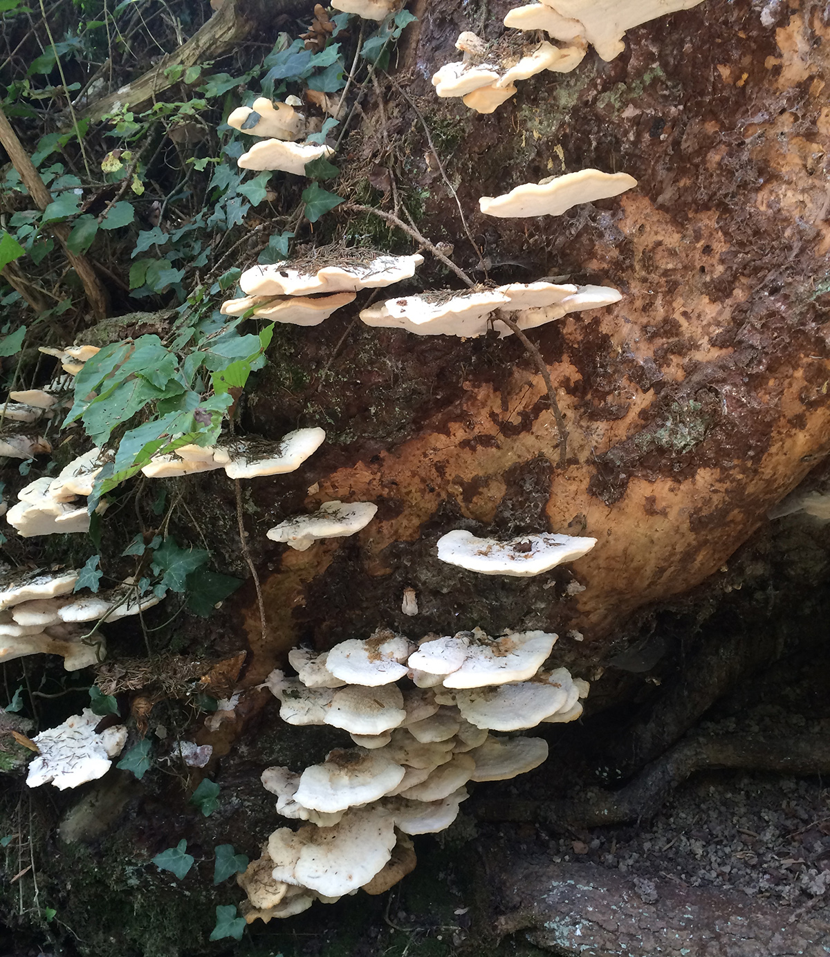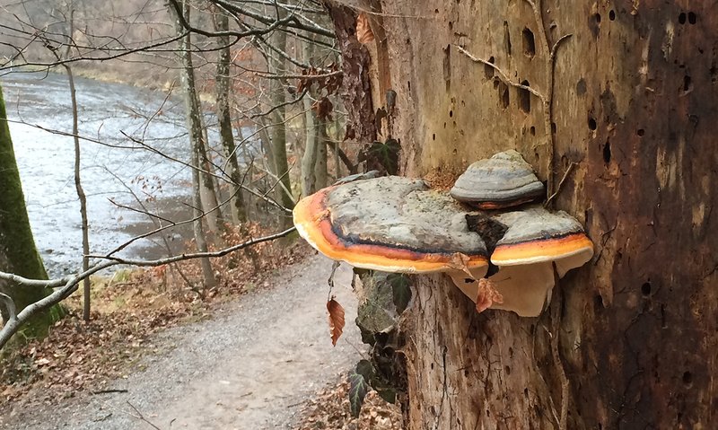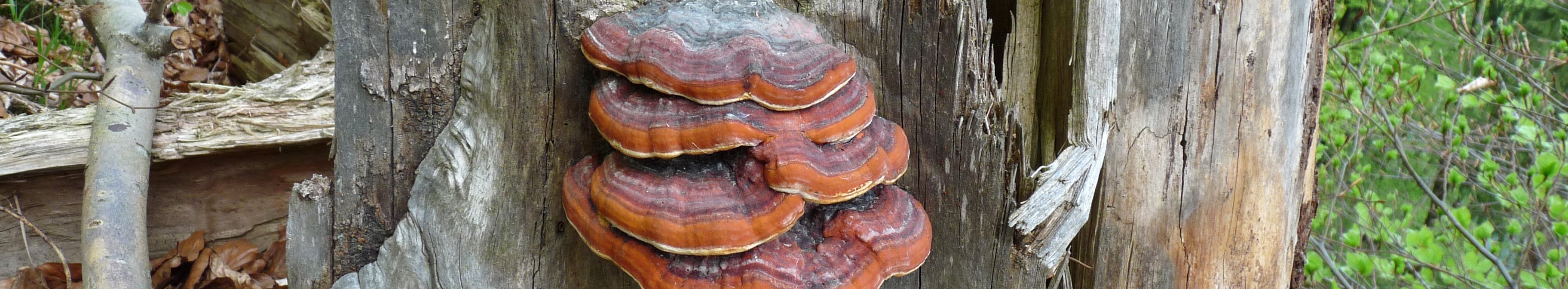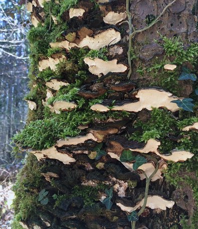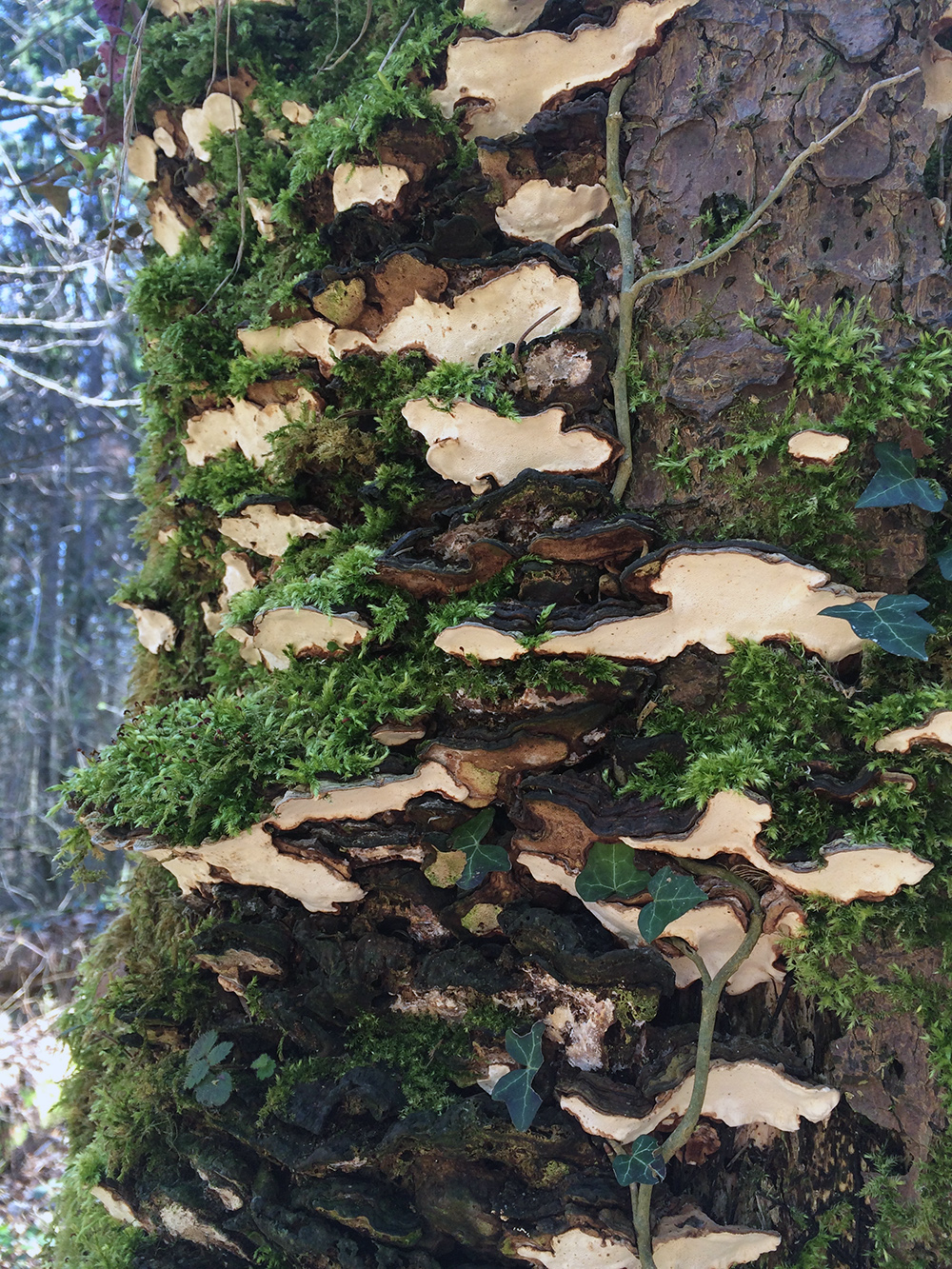 Chiunque conosce i funghi cosiddetti “a mensola”, funghi che crescono orizzontalmente dai tronchi d'albero morti oppure, a volte, ancora vivi (Fig. 1). Questi funghi a mensola di consistenza “spugnosa” (n.d.t.: che la lingua tedesca indica con il termine intraducibile di “Baumschwämme”, letteralmente “spugne arboree”) non sono altro che i corpi fruttiferi dei funghi che abitano il legno. Sono negli effetti le loro ife fungine filiformi, che penetrano all’interno dei tronchi degli alberi, nutrendosi della biomassa legnosa.