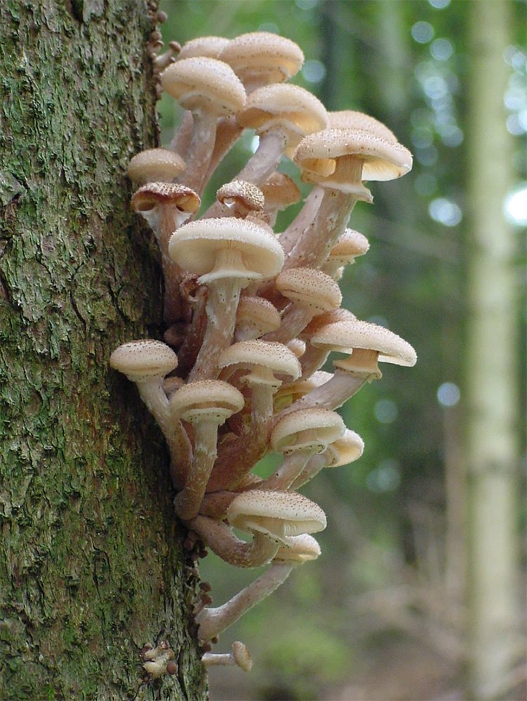 Il chiodino (Armillaria sp.) è un fungo che in autunno si trova spesso sui ceppi degli alberi. Colto piccolo è commestibile, ma in generale non è molto apprezzato dai raccoglitori di funghi. Al mondo sono conosciute più di 40 specie di chiodino. Alcuni di esse sono marciumi molto aggressivi, che attaccano gli alberi causandone la morte. Tra questi anche la specie in questione, Armillaria ostoyae, la quale unitamente a un altro parassita, l'eterobasidio, ha causato nel Parco nazionale Svizzero un'estesa moria di pini montani.