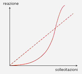 Fig. 5. Profilo delle prestazioni: l’effetto della foresta sul deflusso di una piena presenza di un terreno con una capacità media di trattenere le partecipazioni e una scarsa permeabilità. L'asse orizzontale rappresenta l’entità delle sollecitazioni (precipitazioni in questo caso), mentre l'asse verticale l’entità dell’evento risultante (in questo caso il deflusso della piena). La linea tratteggiata raffigura la reazione tipica registrabile in assenza della copertura forestale, mentre la linea continua quella riscontrabile al di sotto di una copertura forestale.