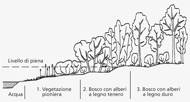 - Sulle terrazze golenali più vicine al letto principale predominano salici e ontani: le condizioni di sviluppo sono sufficientemente stabili da permettere lo sviluppo di boschi pionieri, chiamati "boschi golenali a legno tenero", con specie arborescenti a legno relativamente leggero e poco resistente nel tempo.