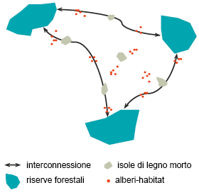 Affinché gli organismi legati al legno morto possano sopravvivere a lungo termine, è necessaria una rete di habitat ricchi di legno morto, aventi un’estensione diversificata (fig. 7). Le riserve forestali naturali rappresentano in tal senso degli habitat di importanza fondamentale. Isole di legno invecchiato e alberi-habitat fungono da ambienti di interconnessione che permettono lo scambio di individui tra le varie popolazioni. Non esiste comunque una ricetta universale per definire la distribuzione ideale di riserve forestali naturali, isole di legno invecchiato e "alberi habitat". Come regola generale, oltre alle riserve forestali naturali, sono necessarie circa due o tre isole di legno invecchiato per ogni chilometro quadrato di foresta, con una superficie minima di un ettaro ciascuna, oltre che da 5 a 10 "alberi habitat" per ettaro.