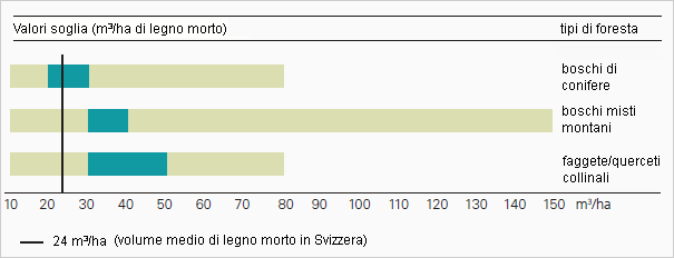 I valori soglia indicano i quantitativi minimi di legno morto che sono necessari per il mantenimento di determinate specie specializzate. E' importante determinare dei valori-soglia per il maggior numero possibile di specie, alfine di fornire dei possibili obiettivi di riferimento in termini di volume di legno morto. Tali obiettivi sono stati fissati dall'Ufficio federale dell'ambiente nella propria Politica forestale 2020 (UFAM 2013): per il Giura, l'Altopiano e il Sud delle Alpi sono 20 m3/ha; per le Prealpi e le Alpi 25 m3/ha.