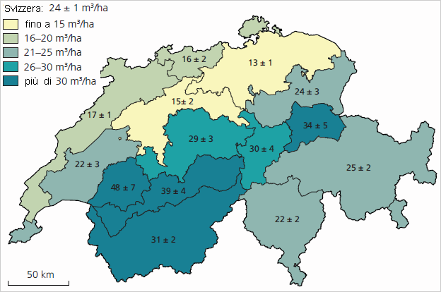 Un trend influenzato anche dal fatto che le utilizzazioni dei boschi non sono più redditizie nelle aree difficilmente accessibili. Il volume di legno morto in Svizzera secondo l'IFN (dati 2009-2017) ammonta in media a 24 m3 /ha (fig. 5). Il 20% delle foreste svizzere, secondo i dati 2009-2017 dell'IFN, non sono più gestite da oltre 50 anni. Da non dimenticare poi, il fatto che oggigiorno i proprietari e i gestori delle foreste sono meglio informati in merito all'importanza ecologica di legno morto.