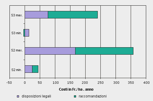 Calcolando l'effetto combinato dei costi aggiuntivi provocati dalle disposizioni legali e dei minori introiti legati alle raccomandazioni, il valore complessivo teorico degli oneri supplementari connessi con la protezione delle risorse idriche nelle zone S3 ammonta da Fr. 9.- a Fr. 240.-/ha e anno, mentre l'importo nella zona intermedia S2 varia tra i Fr. 43.- e i Fr. 358.- (vedi figura 3).