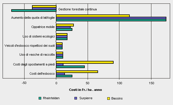 Le raccomandazioni riguardanti la composizione delle specie arboree mirate a favorire la qualità delle acque sotterranee - soprattutto sull'Altipiano - da un punto di vista finanziario assumono un ruolo assai più importante rispetto alle limitazioni connesse con le tecniche di raccolta del legname che vigono nelle zone di protezione. Tenendo conto dei costi aggiuntivi connessi con i carburanti e i lubrificanti ecologici, con il ricorso a macchinari che preservano i suoli e a cippatrici mobili, a seconda dei procedimenti di cura e di rinnovazione adottati gli oneri annui aggiuntivi possono arrivare fino a Fr.192.-/ha.