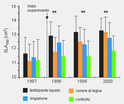 Figura 2 - Superficie specifica foliare (SLA) di 100 aghi nei 4 diversi trattamenti. Le differenze significative (*p<0.05; **p<0.01; ***p<0.001) sono riferite alle varianti "fertilizzante liquido" e "controllo".