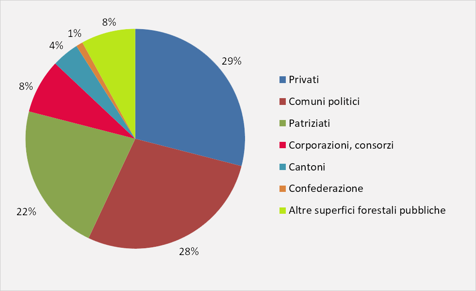 I proprietari pubblici sono quasi 3’400, ma la Confederazione non possiede neanche l’1 per cento della superficie forestale. Anche i Cantoni possiedono complessivamente solo il 4 per cento del bosco svizzero. Grandi superfici boschive appartengono invece ai Comuni politici (28 per cento) e ai patriziati (22 per cento). Un altro 8 per cento è di proprietà di corporazioni e cooperative (Fig. 1).
