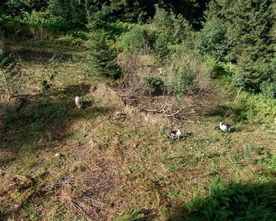 Fig. 6 - Pascolo di bovini presso Geissloch nel comune di Vilters-Wangs. Lotta contro l’ontano verde (tagliato nel 2012 e lasciato in terra). Foto: Monika Frehner