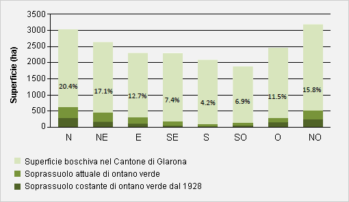 Nel Cantone di Glarona e nel perimetro del Surselva l’attuale soprassuolo di ontano verde è di oltre 2500 ha in ciascuna regione. Nelle valli meridionali del Cantone di San Gallo i soprassuoli di ontano verde sono pari a oltre 1200 ha. L’attuale percentuale di ontano verde sulla superficie forestale totale è del 12% nel Cantone di Glarona, del 19% nella valle Cholschlag, del 22% nella valle Weisstannen e del 28% nella valle Calfeisen. Solo nella valle Tamina la percentuale di ontano verde è inferiore al 5%. All’interno del perimetro del Surselva la percentuale di ontano verde è già del 17% (se si includono le valli laterali non prese in considerazione probabilmente molto oltre il 30%). Tipica in tutte e tre le zone di indagine è l’ampia diffusione dell’ontano verde nel fondovalle posteriore e nella zona del limite superiore del bosco.