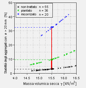 Figura 4 - Stabilità di aggregazione del suolo in funzione della massa volumica secca (densità del suolo) di campioni di terreno non trattati, piantati e micorrizati. Dopo una fase di crescita di sei mesi per una densità media del suolo di 15,5 kN/m3 [=1.5 kg/dm3; n.d.T.], la proporzione della componente del terreno stabilmente aggregato (diametro maggiore a 20 mm) nei suoli micorrizati assume un valore tre volte superiore rispetto a quello dei suoli piantati ma non micorrizati.
