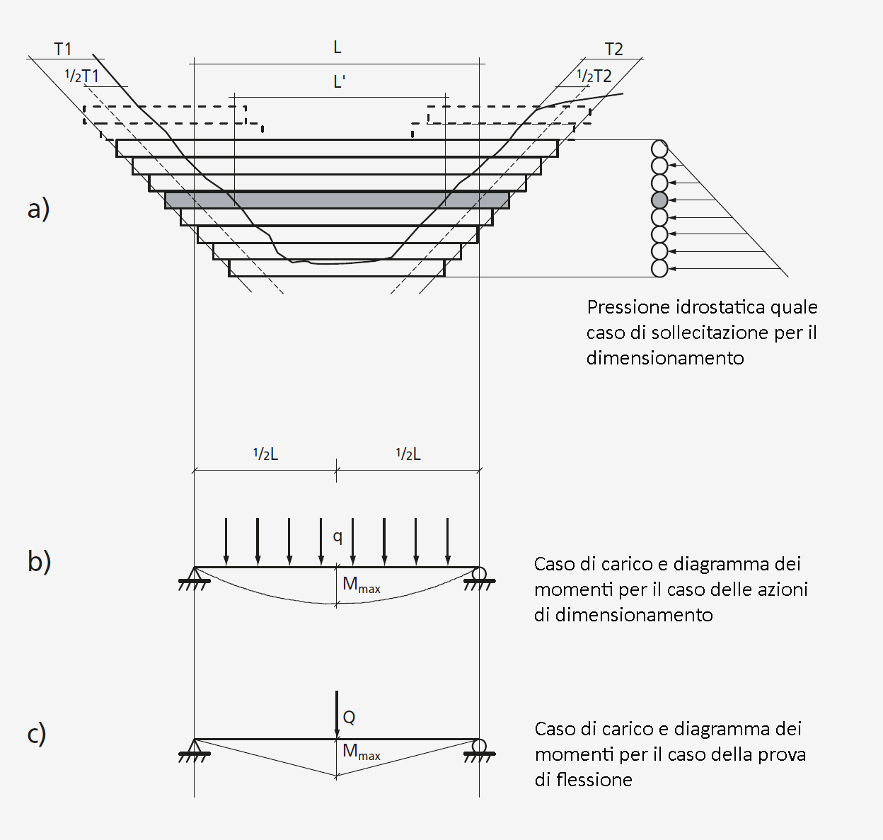 Figura 2 - Rappresentazione schematica delle briglie esaminate. a) Nel dimensionamento si ipotizza l’effetto della pressione idrostatica in caso di invaso completo, ma senza riempimento posteriore. b) Dalla pressione idrostatica esercitata dall’acqua risulta che su ogni tronco di legname tondo grava un carico lineare q. Il momento flettente massimo Mmax agisce al centro della trave. c) La fune metallica che durante le prove è stata fissata al centro della trave genera un diagramma dei momenti di forma triangolare. Il momento flettente massimo Mmax si trova anche in questo caso al centro della trave.