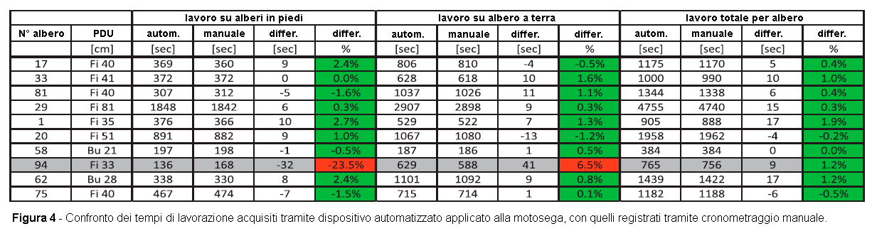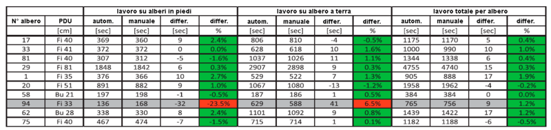 La valutazione della prova eseguita in campo su dieci alberi ha mostrato che la differenza tra l’acquisizione automatizzata ed il cronometraggio manuale dei tempi di lavorazione complessivi è stata costantemente inferiore al 2% (Fig. 4). Per l’albero contraddistinto dal numero 94, la discrepanza è stata più importante, sia per la fase in piedi, che a terra. Ciò è dovuto al fatto che subito dopo l’abbattimento è stata avviata la sramatura, senza interruzioni apparenti nella lavorazione. Di conseguenza, il programma di elaborazione non è riuscito a determinare correttamente il punto di separazione delle due fasi. Tuttavia, anche in questo caso le differenze nel tempo totale di lavorazione (abbattimento e allestimento) corrispondono solo al 1,2%, situandosi su valori molto bassi.