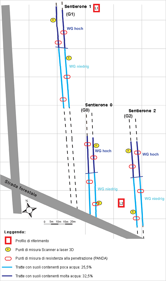 Su ognuno dei sentieroni sono state individuate e demarcate delle tratte di studio con suoli contenenti poca e molta acqua. "Poca acqua" corrisponde al contenuto di acque di origine meteorologica misurato quando è stato eseguito l’esbosco (giugno 2013), che con un valore del 25% circa era comunque relativamente elevato. Le tratte con "molta acqua" sono state irrigate artificialmente, allo scopo di aumentare il contenuto di acqua nel suolo ad un valore di circa il 33%, prossimo al limite di fluidità del suolo.